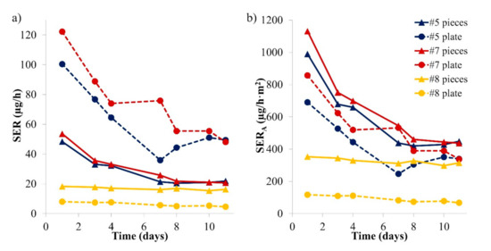 SERA is a common unit for material emission measurements but as the flask method value is based on the weight of the toy, a correlation with the weight-specific emission rate (SERW) was also considered and is presented in Figure 5b. In this case, a better correlation is obtained between the flask method values and the weight-specific emission rate, with a statistically significant correlation (p-value: 0.02876 < 0.05) but a poor R2 (0.470). If only Sample #4 is removed, a R2 of 0.845 and a highly statistically significant p-value of 0.0005 (<0.001) are obtained. The correlation between the microchamber and the test chamber (1 m3 or desiccator) results is better (R2: 0.834, see Figure 4). An interesting observation was that Sample #3 seemed to be made of massive wood and still emitted as much formaldehyde (1.4 mg/h·m2 at Day 10) as the other samples. Such results have also been observed in the past [36] and may be attributed to the lacquer. The area-specific emission rate curves from the toy samples over 10 days in the microchamber are provided in Figure S4.