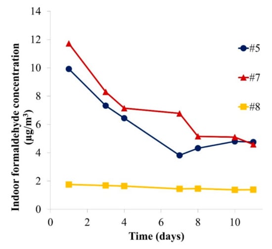 Formaldehyde concentrations were found to be fairly constant after seven days. Over the course of 10 days, the area-specific emission rates were similar in both chambers for all three samples. For Samples #5 and #7, there was no significant offset between both chamber results in contrast to Figure 1. For Sample #8, the average offset between microchamber and desiccator results was +53%, slightly higher than for Samples #1 and #2. For Sample #8, the area-specific air flow rate was only 1.9 times higher in the desiccator than in the microchamber while the ratio between both chambers was 2.3 and 2.6 for Samples #5 and #7, respectively (see Table 1). This finding may contribute to the fact that Sample #8 behaved similarly to Samples #1 and #2 (for which the area-specific air flow was constant between chambers). Moreover, the shape of the pieces from Sample #8 (play set) were thicker and approached the shape of Samples #1 and #2 more than the puzzle pieces from Samples #5 and #7. This may lead to differences in air velocities at sample surface. Additionally, for Samples #5 and #7, a decrease of the formaldehyde emission rate is observed over the first few days. Such a decrease was not observed for Sample #8 or for the particleboards in Figure 1. These differences can be due to more consistent conditions during storage or to the fact that Samples #5 and #7 were coloured with stickers while Sample #8 was painted (see Figure S1). Stickers could emit high formaldehyde concentrations during the first hours. The decrease was also observed for Sample #6 (see Figure S4). Hemmilä et al. (2018) also observed that the formaldehyde profile before steady state depended on the sample: no linear correlation was found between DMC results at Days 1 and 7 for different samples [11].