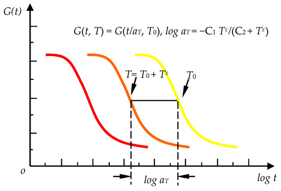 where is displacement components, is thermal expansion coefficient, is temperature increment, , are body force and traction force, is virtual displacement, , are the yarn solid part and the boundary of domain. is the static relaxation tensor at T of the component materials, which can be calculated by translating along the time axis based on the time-temperature equivalence principle [23], as shown in Figure 2. is obtained by the Williams-Landel-Ferry equation and , are the material constants.