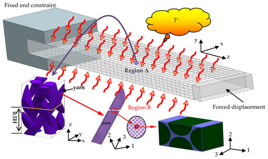 - Establish a micro-scale RUC model. Then, Equation (35) is solved to obtain the characteristic function . Thereafter, the equivalent thermo-viscoelastic properties and of the yarns are computed by Equations (15) and (19).
