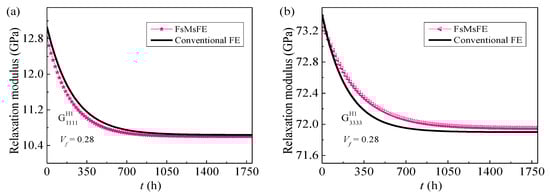 Comparison of the homogenized effective relaxation modulus of yarns calculated via five-step multi-scale finite element (FsMsFE) method with conventional FE method transverse (a) the transverse ; (b) the longitudinal .
