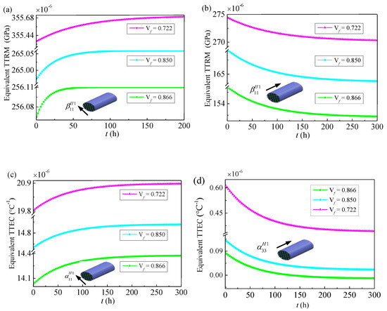 Equivalent time-dependent thermal relaxation modulus and equivalent time-dependent thermal expansion coefficients of yarns versus time for different fiber volume content (ground state) (a) the transverse TTRM ; (b) the longitudinal TTRM ; (c) the transverse TTEC ; (d) the longitudinal TTEC .