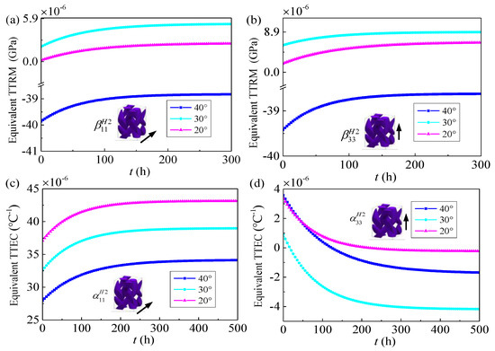 In Figure 5a,b, the yarns are considering the unidirectional reinforced composite with a constant fiber volume fraction 0.722, 0.850 and 0.866, the transverse equivalent TTRM increases monotonically while the longitudinal equivalent TTRM decreases monotonically with the increasing of the time, the transverse equivalent TTRM and longitudinal equivalent TTRM show a downward trend with increasing fiber volume fraction. A similar scenario of effective thermal expansion coefficients in both transverse and longitudinal is shown in Figure 5c,d and they will be reached a steady state. As shown in Figure 6, the effective thermo-viscoelastic properties of the meso-scale RUC under different braiding angles (20°, 30°, 40°) and fiber volume fraction 0.37 are calculated. It can be seen that both the transverse and longitudinal equivalent TTRM are firstly decrease and then increase when the braiding angle increases and the transverse effective TTEC decrease monotonically with the increasing of the braiding angle when the longitudinal effective TTEC firstly increase and then decrease. Additionally, Figure 5 and Figure 6 show that the different fiber fraction and braiding angle in the ground state will affect the thermo-viscoelastic properties of composite in time domain.