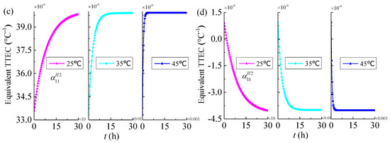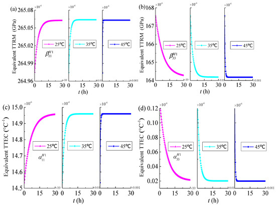 In order to observe the effects of temperature on the thermo-viscoelastic properties of 3D four directional braided composites, the analysis results of yarns (Vf = 0.85) and meso-scale RUC2 (Vf = 0.37,) at different temperatures (25 °C, 35 °C, 45 °C) are shown in Figure 7 and Figure 8. It can be found that the influence of temperature on thermo-viscoelastic properties of 3D four directional braided composites is very obvious and higher the temperature the shorter the time required for the effective TTRM and effective TTEC to stabilize. This phenomenon is similar to the effect of temperature on the viscoelastic properties of 3D composites reported by Seifert et al. [21].