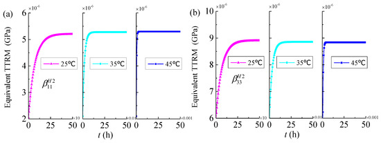 Although the constitutive equation of viscoelastic composites is similar to that of single-phase material expressed by Equation (4), the thermal stress relaxation law of the two materials is different. The thermal stress relaxation law of single-phase materials is the same as that caused by the instantaneous thermal strain , but the thermal stress relaxation law of viscoelastic composites is different. To further illustrate, parameter is introduced and the equivalent TTRM can be written as