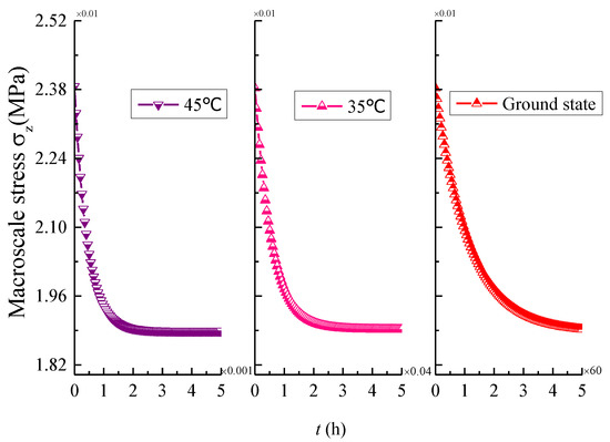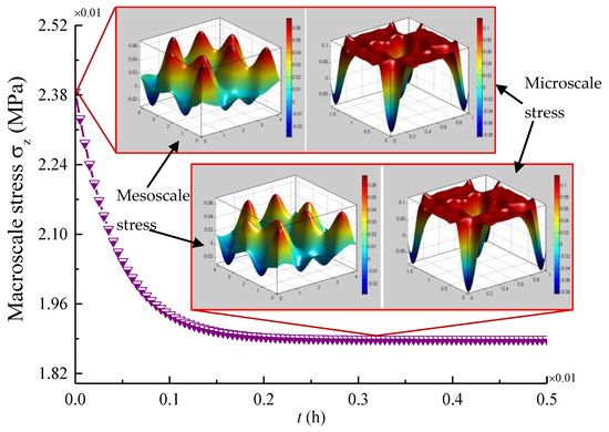 The initial damage of 3D braided composites is commonly attributed to the destruction of different scales, therefore a multiscale stress relaxation analysis is given in this section. Based on the different thermal and mechanical loading boundary conditions, the macro/meso/micro-scale time-dependent stresses can be obtained by using the FsMsFE analysis method presented in the Section 2.2 and Section 3.1.