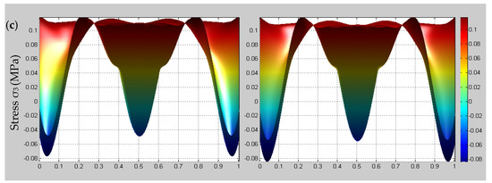 In order to determine the influence of temperature changes on the multi-scale stress of 3D braided composites, the initial and stable state stress distributions of different scales at different temperatures (25 °C, 35 °C, 45 °C) are presented in Figure 10, Figure 11 and Figure 12.