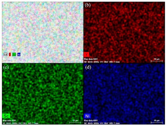EDS elemental mapping (a–d) of as-annealed Y0.25Sc0.7Ni2.