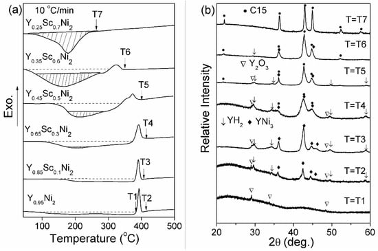 Figure 5a further shows the DSC profiles of Y–Sc–Ni compounds hydrogenated under 100 °C-5 MPa-24 h. The XRD patterns of DSC samples at specific temperatures are shown in Figure 5b. As shown in Figure 5a, a rather broad endothermic peak is followed by a sharp exothermic peak, which is attributed to the dehydrogenation of non-crystalline hydride and the crystallization of non-crystalline hydride, respectively [33]. This assumption is further confirmed by XRD. At the T1 temperature of the DSC curve of the Y0.95Ni2, no crystalline phase exists in addition to the Y2O3. At the T2 temperature, the presence of YH2 and YNi3 phases indicates the crystallization of non-crystalline hydride and subsequent decomposition. Similar DSC results are also reported for the GdNi2 [34], SmNi2 [35], and YNi2 [36] compounds. With the increasing Sc content, the broad endothermic peak contains a sharp part with an increasing shaded area. The broad endothermic peak below the broken line still corresponds to the hydrogen desorption from noncrystalline hydride, while the sharp endothermic peak with a shaded area is attributed to hydrogen release from the crystalline hydride [33]. In addition, the exothermic peak area and the peak temperature decrease with increasing Sc content. XRD patterns of DSC samples at T3, T4, T5, and T6 also show the weak peaks of YH2 and YNi3 phases, indicating that the amount of non-crystalline hydride decreases with increasing Sc content. For the hydrogenated Y0.25Sc0.7Ni2, the only sizeable endothermic peak in the DSC curve further verifies the elimination of HIA.