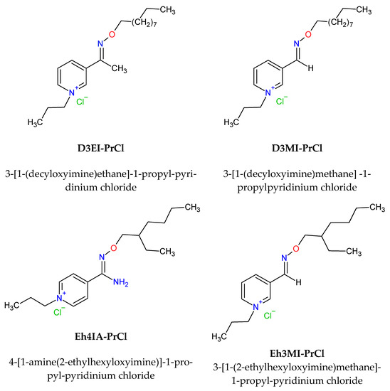 3-[1-(2-ethylhexyloxyimine)methane]-1-propylpyridinium chloride, 3-[1-(decyloxyimine) methane]-1-propylpyridinium chloride, 3-[1-(decyloxyimine)ethane]-1-propylpyridinium chloride, and 4-[1-amine(2-ethylhexyloxyimine)]-1-propylpyridinium chloride were obtained through a two-stage reaction, in which in first stage the appropriate N-alkoxy derivatives were obtained by treating pyridine-4-caboximidamide, (pyridin-3-yl)ethan-1-one oxime and oxime of pyridine-3-carboaldehyde with NaOH to form the appropriate oximate and amidoximate salts. Next, the alkylation reaction was carried out at 80 °C using 2-ethylhexyl or decyl bromide and isopropanol as a solvent. The mixture was heated under reflux for 6 h. The crude product was then chromatographed on silica gel with toluene as eluent. The reaction quaternization with propyl chloride was carried out in a round bottom in dry acetone and warm up to 40 °C. Then the mixture was filtered and concentrated under a rotary evaporator. The crude product was recrystallized from acetone. Purities of all compounds were 99.9% and were determined by NMR (1H and 13C) spectroscopy. All the studied compounds were synthesized with a yield of 96-99%.
