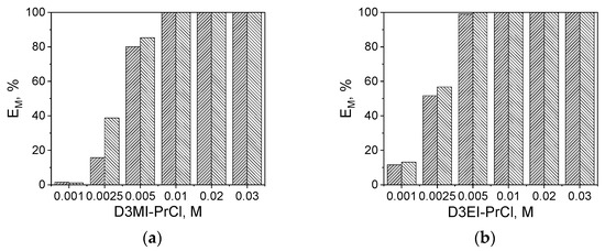 Pt(IV) and Pd(II) species were completely extracted into the organic phase when D3EI-PrCl concentration was above 5 × 10−3 M (Figure 2b). Likewise, the concentration above 5 × 10−3 M of the D3MI-PrCl did not influence the extraction efficiency of Pd(II) and Pt(IV) (Figure 2a). However, a change in the concentration of D3MI-PrCl affected positively the efficiency of metal ion extraction, reaching the quantitative extraction of Pd(II) and Pt(IV) at 0.01 M D3MI-PrCl concentration, which is also visible in high values of distribution ratio (Table 6).
