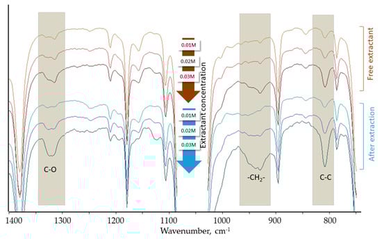 FT-IR analyses of the organic phases before and after extraction, and after stripping were carried out on a Vertex 70 Spectrometer (Bruker Optics FT-IR) in the range of IR 600–4000 cm−1. The spectra of the organic phases were recorded using KRS-5 (Thallium Bromoiodide) cuvette. The spectra were carried out with a standard resolution of 2 cm−1.