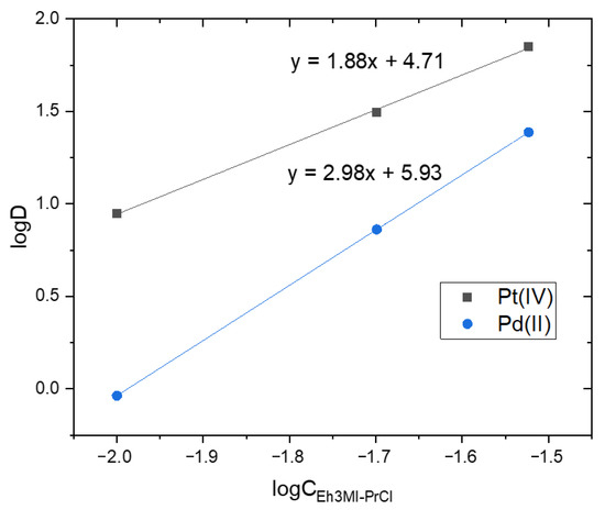 It is visible that decyl substituted extractants (D3EI-PrCl, D3MI-PrCl) are not selective to separate species of Pt(IV) from Pd(II) because ions of both metals are extracted almost quantitatively and separation factors (calculated according to Equation (2)) of Pt(IV) separation over Pd(II) are equal to zero. Only the extraction with Eh3MI-PrCl (in the studied concentration range) shows a preference for Pt(IV) species transport to the organic phase compared to Pd(II) transfer. The indicated selectivity could be explained, to some extent, by the number of extractant molecules bound with metal species in the organic phase. Based on the extraction reaction assumed for the investigated novel extractants a slope analysis (Figure 4) can be conducted as a function of the equilibrium concentration of Eh3MI-PrCl to determine the composition of a metal-extractant complex in the organic phase.