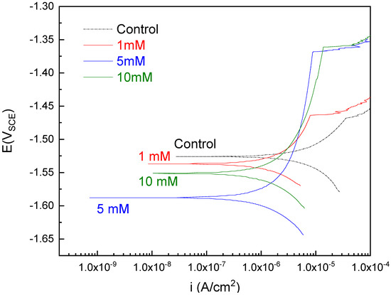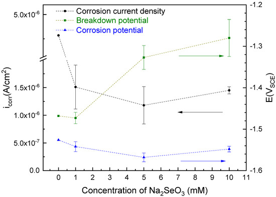 After immersion in different coating baths with different selenite concentrations, a uniform pale grey film was formed on AZ31. In Figure 1, anodic polarization curves were collected on coated samples immersed in 0.1 M NaCl solution. The scan was collected after a 1-h OCP hold aiming to stabilize the corrosion potential. Corrosion current density values were determined by extrapolation of the linear portion of the log-based cathodic polarization curves to the intersection with corrosion potential values [14]. Breakdown potential described the breakdown of the protective film leading to a sharp increase in current density [35]. Values for the control experiment were approximately 9.0 × 10−6 A/cm2 for corrosion current density and −1.52 VSCE for corrosion potential. All of the anodic polarization curves with coating exhibited a shift towards lower current density. An increase in the breakdown potential was observed in 5 mM and 10 mM samples.