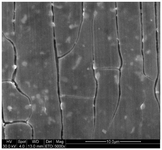 The observed protective coating morphology was nearly identical among 1 mM, 5 mM, and 10 mM selenite immersion solution. The representative coating morphology formed by the 2 h exposure in 5 mM selenite bath, represented in Figure 4, which was similar to the previous inhibitor study and chromate conversion coating [14,20]. The shrinkage cracking phenomenon is an artifact of surface film dehydration in the microscope column. It indicates the surface films are likely a hydrated gel film that contains selenium in it which is the genesis of corrosion resistance. This gel shares characteristic of other important gel films such as chromate conversion coatings that form over a heterogeneous microstructure [19,20,21,22,23]. Its formation is most likely triggered by the reductive alkaline interfacial characteristics. The cracking on the surface was mostly in the same direction which may relate to the sample polishing defects. Several small bright sites may indicate the concentrated selenium element [14].