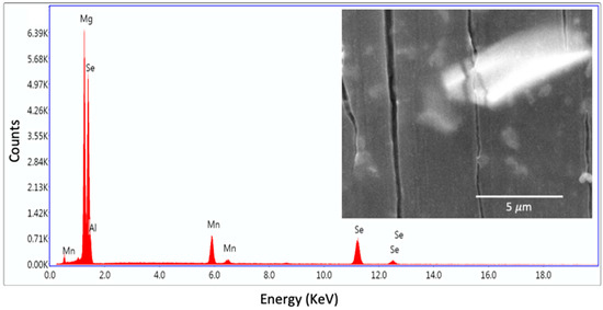 Energy-dispersive X-ray spectroscopy (EDS) provided an elemental analysis of protective coatings. As indicated in Figure 5, the coating consists mainly of Mg, Se, Al, and Mn. The high local intensity of Al and Mn signals come from the Al-Mn intermetallic in this study. These results indicate an intermixing of the Mg and Se through the protective coating.