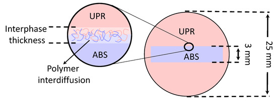 To study the interdiffusion of thermoset resin into thermoplastic, ABS specimens were prepared by cutting them using a wet saw into parts with estimated dimensions of 15 mm × 15 mm × 3 mm followed by edge sanding with #500 SiC foil to remove any debris. Next, an isopropyl alcohol and a mixture of water were utilized to wash ABS specimens to remove any remaining particles and contamination. Specimens were dried in the oven at a temperature of 60 °C for 24 h and then left in a desiccator to reach room temperature. Afterward, ABS specimens were placed vertically in the middle of a cylindrical embedding mould with a diameter of 25 mm by using a couple of metallic clamping rings. The degassed UPR resin mixture was poured onto the ABS specimens until the resin completely covered them. Effect of temperature on the interphase was studied by preparing the samples and placing of the moulds in the preheated oven fixed at the set temperatures of 25 °C, 35 °C, 40 °C, 50 °C, and 60 °C and curing for 24 h followed by a post-curing process at 60 °C for 24 h. After the de-moulding of samples, Struers polishing system (Teramin-30, Struers, Cleveland, OH, USA) was employed to polish the cross-sections of specimens with SiC foil of #500, #1000, #2000 and #4000, in the given order. The final polishing of the embedded specimens were done by using OP-S NonDry. A schematic view of the cross-section for the co-bonded ABS-UPR sample and the resulting interphase due to polymer interdiffusion are shown in Figure 1.