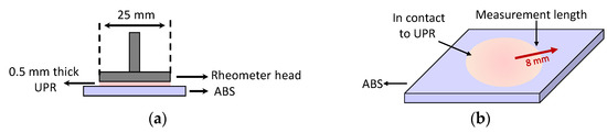 Furthermore, the surface swelling of ABS by UPR resin were examined at room temperature. For this, a parallel plate apparatus of the rheometer (in stationary mode) (Anton Paar Germany GmbH, Ostfildern, Germany) was employed to confine the resin between the head plate and ABS sheet (as the bottom plate) as shown in Figure 2a. The nominal normal force was set to 0.1 N in the rheometer. The normal force was kept constant to ensure the contact of resin to the rheometer head and surface of the specimen and to prevent resin starvation due to diffusion at the study surface. The capillary forces between UPR and the plates which might cause a possible resin flow out was prevented by the plate-plate configuration. Herein, 50 mm × 50 mm ABS plates were cut, edge sanded as mentioned in detail in Section 2.2, and then were glued on the surface of the bottom plate of the rheometer. The plate-plate distance was set to 0.5 mm and was filled with UPR, i.e., without mixing it with the liquid peroxide system, and kept for 60 min. Next, Keyence VK-9700 confocal microscope was used to capture the changes in the surface topology of ABS due to swelling by UPR. The height and spatial resolutions were 1 and 120 nm in the confocal microscope which had a laser with 408 nm wavelength. As seen from Figure 2b, the confocal microscopy measurements were performed on the path which covered the region with and without UPR to define the surface swelling of APB. The length of the scanned length by the confocal microscopy was approximately 8 mm.