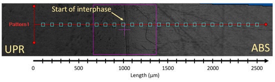 where d was the diagonal length of the resultant impression, and α was defined as 1.8544 for the Vickers indenter [47]. Figure 4 shows an example pattern and sample configuration used in the microhardness measurements in the vicinity of interphase for ABS and UPR. A total of 25 indentations for each line were conducted with 100 µm intervals in the width of interphase as shown in Figure 1 in which the initial 1000 µm was for the UPR and the rest covered the interphase and ABS regions. The hardness profiles were reported for each temperature determined from the average measurements for at least three specimens.