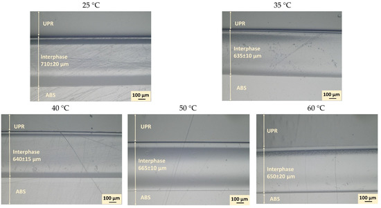 Micrographs showing the interphase formation between ABS and UPR at different temperatures.