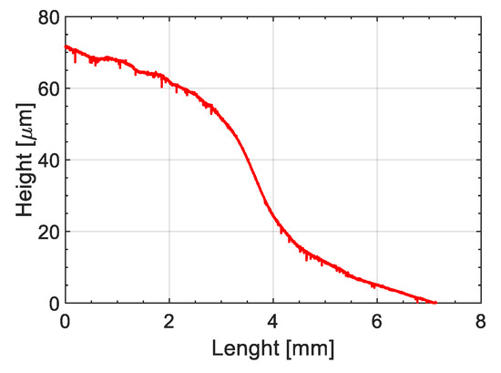 Figure 5 reveals the optical microscopic observations of ABS-UPR interphases indicating the average interphase thickness formed at different temperatures ranging from 25 °C to 60 °C. It was observed that an interphase was formed between ABS and UPR at all temperature ranges with no visible gradient of diffusion. Nonetheless, the interdiffusion fronts in both sides of formed interphases were slightly different from inner sections which implies the contribution of various phenomena in interphase formation. Therefore, an overview image of interphase formed around the ABS specimen at 25 °C was constructed by stitching several overlapping microscopic images as shown in Figure 6 to illustrate the effect of boundary conditions and constraints such as metallic clamps on the interphase formation. In Figure 6, a dash-lined frame is inserted in the image to estimate the boundaries of the original ABS specimen before interactions with UPR. The frame size and location were approximated, based on the location of metallic clamping rings and nominal thickness of the ABS sample before embedding. Figure 6 reveals that the interphase formed around the ABS noticeably exceeded the boundaries of the original ABS sample (dashed frame). To elaborate, it was expected to have the diffusion in both directions of UPR into ABS and ABS into UPR. Nevertheless, diffusion of ABS into UPR was at a much lower level compared to UPR into ABS due to the higher molecule size and lower molecular mobility of ABS as compared with liquid UPR [48,49]. However, the difference in the interphase thicknesses inside and outside of the frame was not as significant as it was anticipated. Therefore, swelling of ABS with UPR was a contributing parameter in the interphase thickness. In this regard, the swelling behaviour of ABS in contact with UPR was studied by placing the UPR on the surface of the ABS sample in the rheometer as mentioned. Figure 7 depicts the confocal microscopy results of the surface profile of ABS after being in contact with UPR in the rheometer. It is clearly seen that the ABS surface was swelled and its height increased approximately 70 μm as compared with the rest of the specimen. The increase in the ABS sheet thickness confirmed the swelling behaviour of ABS in contact with UPR.