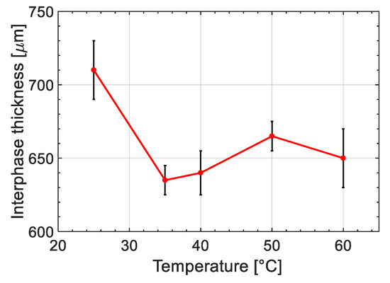 Moreover, it can be seen in Figure 5 that the process temperature influenced the interphase thickness considerably. Figure 8 displays the changes in interphase thickness with respect to the process temperature. It is seen that the thickest interphase was achieved for specimen prepared at 25 °C with an interphase thickness of 710 ± 20 μm while the thinnest interphase was observed at 35 °C as 635 ± 10 μm. It can be seen in Figure 8 that the interphase thickness sharply decreased by increasing the temperature from 25 °C to 35 °C followed by a gradual increase after 35 °C up to 50 °C and slightly drops from 50 °C to 60 °C. The controversy effect of temperature on interphase thickness under and above 35 °C can be described by the effect of temperature on the cure kinetics and diffusion kinetics of the resin. An increase in temperature was expected to accelerate the curing kinetics leading to a decrease in the time available for the interdiffusion process (decreasing factor for interphase thickness). However, the rate of change in the cure kinetic is different at low and high temperatures. At higher temperature, the peroxide was already over its thermal activation temperature threshold (the employed initiator was designed for application in room temperature and above it). Therefore, the acceleration rate was lower while at the lower temperature an increase in temperature can provide the necessary activation energy for peroxides and boost the reaction kinetics significantly [50]. To obtain a comprehensive understanding of the effect of temperature on the interphase formation, cure kinetics and its mechanical properties, and interdiffusion process were investigated and further described in the next section.