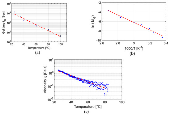 (a) change in gel time vs. temperature, (b) ln(1/tG) vs. 1000/T and fitted line based on Equation (16), and (c) viscosity change as a function of temperature for UPR.