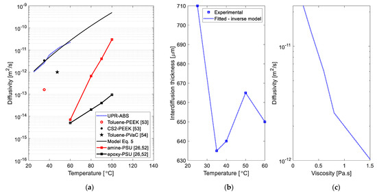 The diffusivity of UPR into ABS was estimated by using Equation (4) and the results obtained are shown in Figure 10. The inverse diffusion model resulted in an exact value for the interdiffusion thickness as seen in Figure 10b for the corresponding diffusivity values. It can be seen in Figure 10a that the fitted diffusivity was found to be in the range of 10−12–10−10 (m2/s) for the temperature range of 25–60 °C. The estimated magnitudes of the diffusivities matched with the reported diffusivities of other systems such as epoxy-PSU [26,52], amine-PSU [26,52], toluene-PEEK (for 0% initial crystallinity of PEEK) [53], CS2-PEEK (for 0% initial crystallinity of PEEK) [53] and toluene-PVAc (for mass fraction of toluene of 0.1) [54] as seen in Figure 10a. The trend of the temperature dependent diffusivity was captured well with the temperature dependent model given in Equation (5) with m2/s and cal/mol. The diffusivity coefficient magnitude obtained and its trend with temperature was in conformity with available literature. The relation between the experimentally obtained viscosity and the temperature dependent diffusivity obtained by the inverse diffusion model is shown in Figure 10c. It can be seen that the diffusivity was found to be inversely proportional which supported the aforementioned observations regarding the interdiffusion thickness and viscosity. In addition the trend obtained for the diffusivity vs viscosity also matches with the findings in [55] for the diffusion of organic molecules in sucrose–water solutions.
