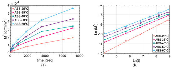 (a) Resin uptake vs. time for ABS, and (b) Ln(M*) vs. Ln(t) based on Equations (7) and (8).