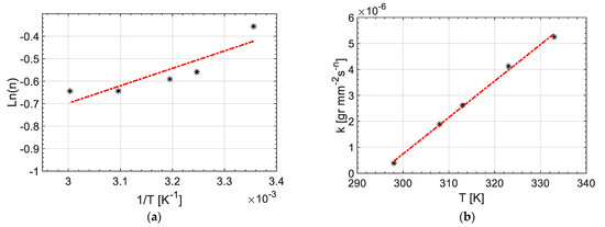 Nevertheless, to obtain a kinetics model for a continuous range of temperatures based on Equation (8), it was needed to have a model for n and k over experimental temperatures. Herein, n and k are approximated by Equations (9) and (10) as: