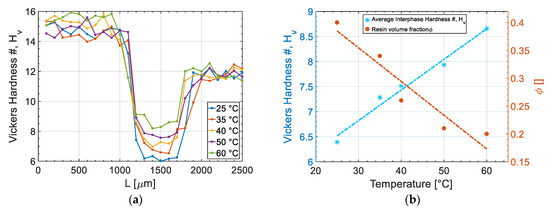 To relate the microhardness at the interphase to the processing condition and microstructure of interphase, Figure 13b exhibits the averaged harness at the interphase (average of 1200 µm–1700 µm) and volume fraction of resin at the interphase (φ) calculated by Equation (14) on different processing temperatures. It can be seen that samples prepared at higher temperatures had a lower φ and hence a less resin presence at interphase to act as a plasticizer and consequently this resulted in a higher hardness values compared to specimens prepared at lower temperatures. On the other hand, samples prepared at lower temperatures showed a lower hardness due to higher volume fraction of resin at the interphase. Figure 13b provides a clear correlation on the process-microstructure and properties relation at the interphase of ABS with UPR.