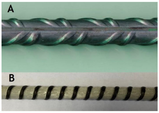 Concrete reinforcement–rebars subjected to mechanical testing; (A) B500SP steel, (B) GFRP rebar manufactured by Ankra company (Poland).