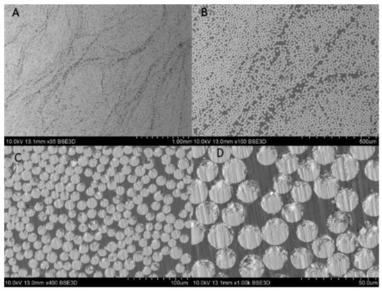 For the composite material, quality evaluation is important to identify the microstructural features of composites like fiber distribution, evidence of voids and bubbles, fiber aggregation rate, as well as the measurement of the fibers diameters and its variability. Figure 3 shows the part of the rebar’s cross-section, and Figure 4 gives the longitudinal section of the specimen. In the observed microstructure it can be stated the uniformity of fibers’ distribution is relatively high, and the fibers are dominant without any inclusions. Comparable diameters of fibers warrant a good quality of fibers used by manufacturers. For the longitudinal cut sample, the SEM image shows 2 different parts, the outer (A, B), and the central (C, D) part of the rebar (Figure 4). Part A and B allow us to observe an overwrapped layer on the GFRP rod, in which fibers were cut transversally, and longitudinally in the major part of the rod. Other parts (C, D) show the distribution of the fibers in the central part of the rod. Also based on the measurements from Figure 5 it can be concluded that the glass fiber diameters vary from 15–17 µm.