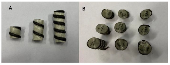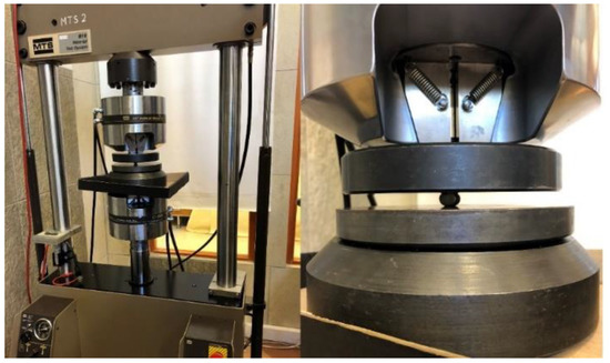 This test was focused on the longitudinal tensile strength of FRP rebars. The length is a crucial parameter that influenced the value of stress, so the Weibull distribution was applied to normalize the obtained results. During the diametral compression test, the composite rebar was loaded perpendicular to its long axis. Also, in this experiment, the MTS 810 testing machine was equipped with compression platen as is shown in Figure 7. The preparation of the samples included their cut for a specific length. In this research, three various lengths (10 mm, 20 mm, and 30 mm) were investigated with three repetitions.