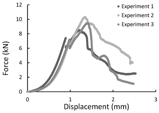 The force-displacement graph for composite specimens of 20 mm length registered during the diametral compression test.