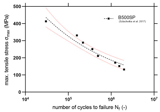 For the comparison of the fatigue properties, Szlachetka et al. [36] discussed the fatigue phenomenon of the ribbed steel rebars under tensile mode fatigue (using R = 0). Based on the data available in [36] the S-N curve with 95% confidence intervals is plotted in Figure 19. Also, statistical outputs are computed in Table 7.