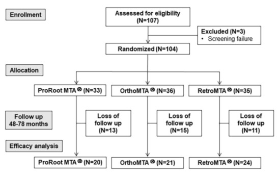 In total, 82 patients (aged 29.3 ± 14.83 years; 51 females and 31 males) were included, and 104 teeth were treated. Initially, 33, 36, and 35 teeth were initially allocated to the ProRoot MTA, OrthoMTA and RetroMTA groups, respectively. The follow-up periods were recorded as within 1 year for 78/104 teeth and as 48 to 78 months for 65/104 teeth. Twenty cases of ProRoot MTA, 21 of OrthoMTA, and 24 of RetroMTA were included in this study. The overall recall rate of more than 4 years was 62.5%, and the mean follow-up period was 62.7 months. Some patients who refused asymptomatic check-ups were unable to follow the recall schedule and were considered “drop-outs”. The progress report of partially pulpotomized cases after overall follow-up is depicted as a flowchart in Figure 1.