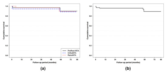 Kaplan–Meier curves of failure-free outcomes in partial pulpotomy using three hydraulic silicate cements. (a) The cumulative rates suggest that there was no significant difference between the three tested materials. (b) The overall success rate of HSC partial pulpotomy was 89.3%.