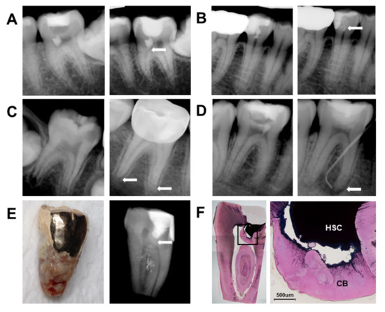 Radiographic and histologic evaluation of partial pulpotomy with three hydraulic silicate cements: (A) 17 Y, F, #36, OrthoMTA, 78 months follow-up: Calcific barrier formation (white arrow) with no clinical symptom. (B) 29 Y, F, #45, ProRoot MTA, 61 months follow-up; MTA has remarkably washed out (white arrow) with no clinical symptom and thin calcific barrier formation. (C) 6 Y, M, #46, OrthoMTA, 64 months follow-up: Apexogenesis is seen (white arrow). (D) 22 Y, M, #46, RetroMTA, 59 months follow-up: Increased periapical radiolucency with sinus tract formation (white arrow). (E) 49 Y, M, #37, ProRoot MTA, 78 months follow-up: Extracted tooth due to advanced periodontitis. The radiograph shows a thick calcific barrier formed without canal calcification (white arrow). (F) A histologic image of (E)—low magnification (left) and high magnification (right, 40×) images shows continuous calcific barrier under HSC. HSC: hydraulic silicate cement; CB: calcific barrier.