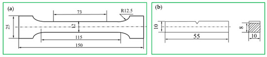 Size of samples for (a) tensile test and (b) impact test (mm).