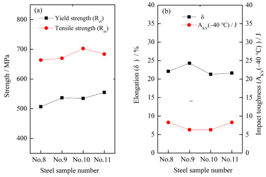 The mechanical properties of the four types of ULCB steels are shown in Figure 3. The four types of ULCB steels in as-rolled state have higher strength and better plasticity but lower impact toughness at −40 °C. The elongation (δ), yield strength (Rel), and tensile strength (Rm) of the three performance indexes are above 20%, 500 MPa, and 650 MPa, respectively. However, the Charpy V-Notch (CVN) impact toughness at −40 °C (AKV (−40 °C)) of the four types of experimental steels in the as-rolled state did not vary significantly with the change in niobium content and is lower than 10 J. The yield strength of No. 8 steel with an average of 507 MPa is the lowest. The yield strength of No. 11 steel is the highest, reaching 555 MPa. The yield strength of No. 10 steel is similar to that of No. 9, which is approximately 535–537 MPa. This suggests that the Rel of all experimental steels increases with niobium content. No. 10 steel has the highest tensile strength, exceeding 700 MPa. The tensile strength of steel No. 8, 9, and 10 increases in turns. However, the tensile strength of steel No. 11 with a niobium content of 0.107% is lower than that of No. 10 with a niobium content of 0.084%.