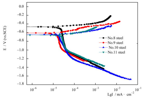 The polarization curves of the four types of experimental steels exposed to 3.5 wt.% NaCl aqueous solution in the initial soaking stage are shown in Figure 4. The polarization curves of the four types of steels have similar characteristics. With the increase in current density, the anode precipitation potential increases and the cathode precipitation potential decreases.