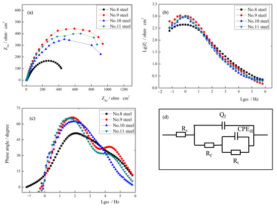 The Bode plots reflect the relationship between the impedance modulus, phase angle, and frequency. Figure 5b shows the characteristics of the relationship between the impedance modulus and frequency. The impedance modulus measured in the highest frequency region in the Lg Z—Lg ω Bode plots represents Rs. The impedance modulus measured in the lowest frequency region represents the sum of Rs and Rt. The information shown in Figure 5b is consistent with that shown in Figure 5a. The solution resistance Rs changes slightly; however, the sum of Rs and Rt gradually increases with increasing niobium content, except for steel No. 9. The (Rs + Rt) of steel No. 9 is the largest. Rt is inversely proportional to the degree of electrochemical reaction [30,36]. Therefore, Figure 5b also shows that, in steel No. 8, 10, and 11, the charge transfer resistance of the corrosion reaction increases, and the degree of corrosion reaction decreases with increasing niobium content.