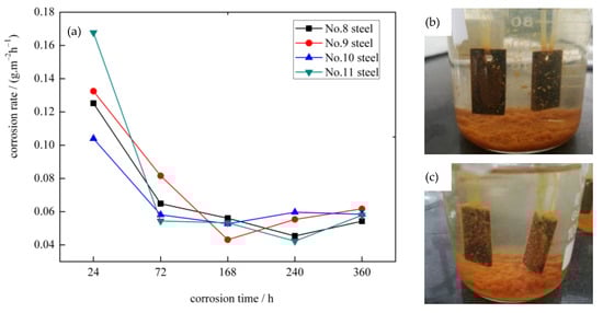 The weight-loss method is the most basic and effective quantitative evaluation method in the study of corrosion resistance of materials. The corrosion rate curves of the four types of bainite steels in 3.5 wt.% NaCl solution based on gravimetric experiment results are demonstrated in Figure 6a. The corrosion phenomenon observed in steel No.10 and 11 was soaked in 3.5 wt.% NaCl solution for 168 h is shown in Figure 6b,c. As shown in Figure 6a, the corrosion rates of the four types of ULCB steels are approximately the same in general trend. Within 0–360 h of corrosion time, the corrosion rate of the four types of steels is relatively high during the initial immersion stage. With the increase in immersion time, the corrosion rate gradually decreases and becomes stable; then, the corrosion rate increases slightly. Although the overall corrosion rate trend is similar, the time nodes of the corrosion rate valley values of the four types of steels are different.