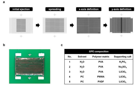 Five GPE ink formulations were selected and developed (Figure 1c). Formulations 1, 2, and 3 were aqueous electrolytes with the advantages of high ionic conductivity, non-flammability and a relatively simple manufacturing process. These formulations commonly used PVA as the polymer matrix, but employed different conductive substances: H3PO4, Na2SO4, and LiClO4, respectively. H3PO4 is widely used in aqueous electrolytes owing to its high ion mobility, but it can cause unwanted side reactions due to its high acidity. Na2SO4 is widely used as a neutral conductive substance because of its high stability and wide voltage window [,]. LiClO4 has recently gained industrial attention because of the high involvement of Li ions, stemming from the large size difference between the anion (ClO4−) and the cation (Li+). LiClO4 dissolves well in most polymer matrices because of the coordination interactions between the polar groups at the polymer hosts and Li ions [,]. Formulations 3, 4, and 5 were based on the same conductive substance (LiClO4) but different polymer matrices: PVA, PMMA, and PVDF, respectively. PVA has been widely used due to its high mechanical strength, non-toxicity and high chemical and thermal stability [,,]. PMMA has good mechanical properties and compatibility to various salt materials [,,]. PVDF also has good affinity and stability when combined with most salt materials [,]. The fluorine atoms in the PVDF backbone promote the dissociation of lithium salts into lithium ions, thereby increasing the ionic conductivity []. Room temperature ionic liquids may have viscosity comparable to some GPEs but they have not been considered here, as it is beyond the scope []. There are also deposition first-then-firming methods, but they were not considered because they require additional steps and instruments and additional labor [].