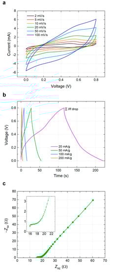 Electrochemical analysis of the printed supercapacitor with PVDF-LiClO4 GPE. (a) Cyclic voltammetry results at various scan rates. (b) Galvanostatic charge and discharge results at various current densities. (c) Electrochemical impedance spectroscopy results.