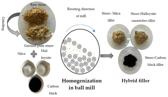 Three different types of straw-based fillers were used in the study. The materials were prepared by hybridizing wheat straw (local farms from Poland) with nano-additives. Silica, halloysite and carbon black were proposed as functional agents: