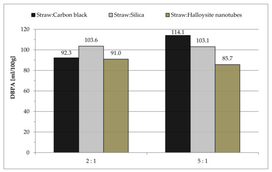 In the case of hybrid straw fillers with silica, no significant change in the absorption of n-dibutyl phthalate was shown depending on the weight ratio used. The DBPA value was on average 10% lower than the highest recorded during the test (sample Straw:Carbon black_5:1).