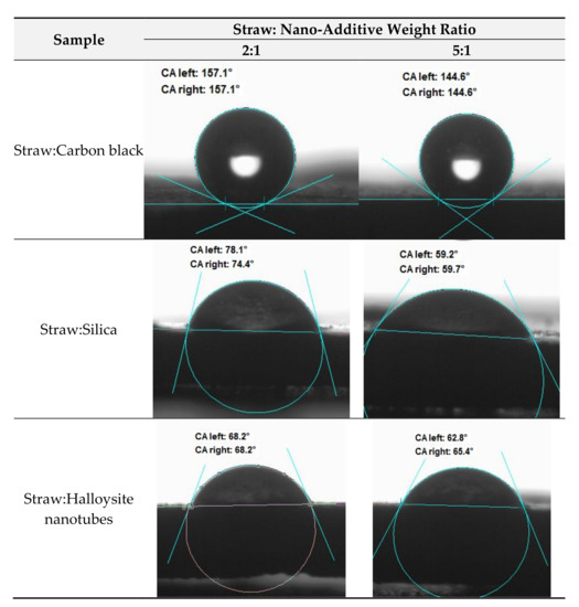 Measurement of the contact angle of the straw materials with water was carried out on pressed filler discs. An OCA 15EC goniometer (DataPhysics Instruments GmbH, Filderstadt, Germany) was used to place a drop of distilled water (10 µL) on the smooth surface of the pressed fillers. Then, just after the water drop was deposited, a picture was taken. Based on the drop shape analysis using the software, the value of the contact angle was determined.