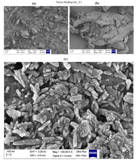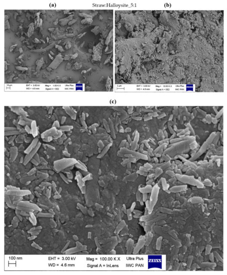 The morphology of the obtained straw fillers was assessed based on the SEM images presented in Figure 4, Figure 5, Figure 6, Figure 7, Figure 8 and Figure 9. When analyzing the obtained images, it can be seen that in all cases, the straw was present in the form of particles of different sizes and shapes. It had the form of thin plates ranging in size from several dozen to several micrometers. The variety of the obtained straw particles after grinding, i.e., mechanical modification, could be explained based on their structure. The larger straw particles could be unbroken elements of the cell wall. The wheat straw consisted mainly of cell walls in which cellulose was one of the main components. In the cell walls, parallel chains of cellulose were hydrogen bonded to form microfibrils, which were the basic unit of the plant cell wall structure and were characterized by high strength [64]. They greatly contributed to the mechanical strength of the plant cell walls and acted as their skeleton, which greatly hindered their breakdown. The microfibrils were linked by a gel matrix composed of hemicelluloses, lignin and other carbohydrate polymers. They were much less durable, which in turn facilitated the fragmentation of the material. In the case of nano-additives, it was observed that their particles were homogeneously deposited on the straw surface. Besides, the images with the largest magnification (Figure 4, Figure 5, Figure 6, Figure 7, Figure 8 and Figure 9c) showed the architecture of the nano-additives used well. Thus, they confirm that the structure was not damaged during mechanical modification. Halloysite particles were in the form of oblong tubes, while silica and carbon black were in the form of spherical particles.